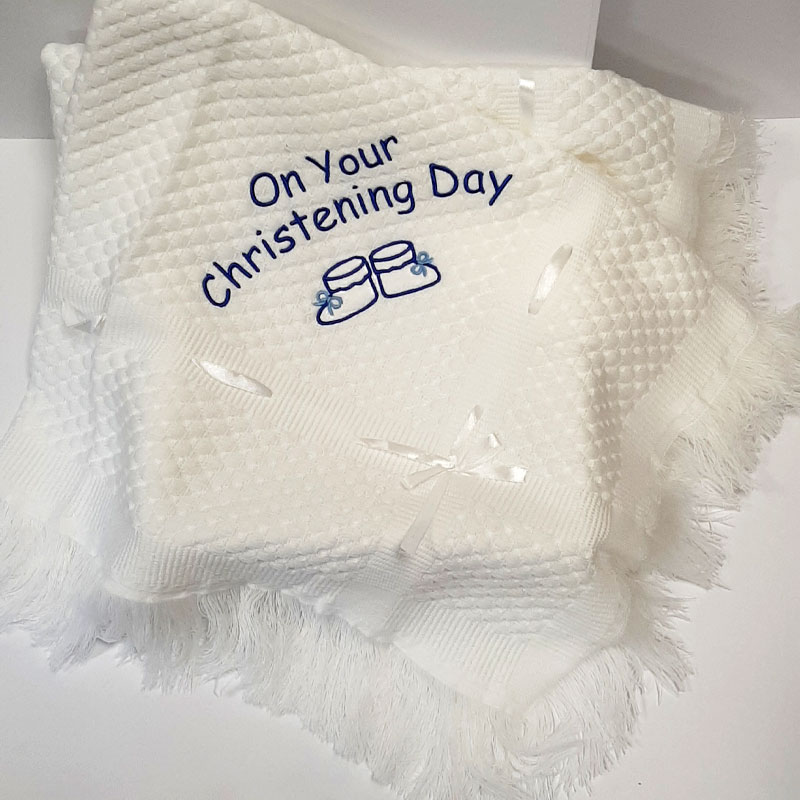 The embroidery as shown has a pair of sweet baby booties & “on your Christening Day”. This is available in pink or blue. Also available to embroider is just babys Name & Date of Christening. This shawl comes wrapped in clear cellophane with a soft matching colour ribbon to finish.