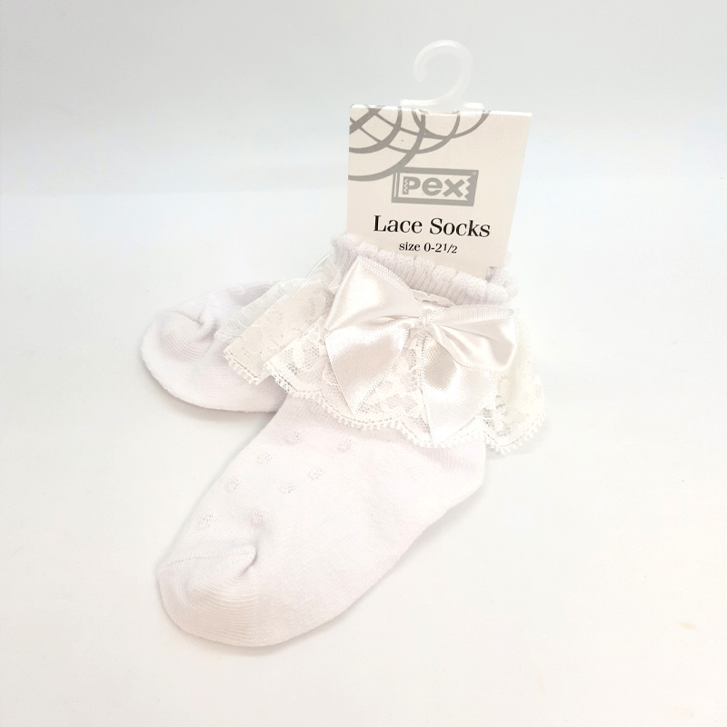 These stunning baby girl socks add a touch of luxury to any outfit. This cotton rich sock features an elegant textured spot and there is a beautiful deep lace trim at the softly scalloped welt with a gorgeous ribbon bow.