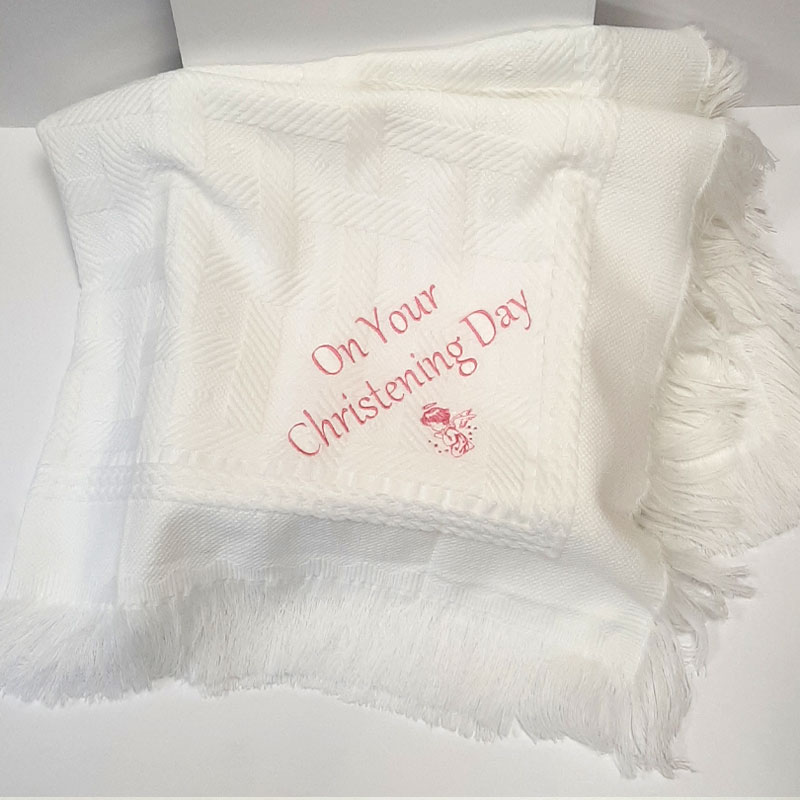 This is available to order in pink or blue. It is also possible to order this shawl with Babys Name & Date of Christening, This would be stitched as follows ”Jack’s Christening Day“ & date with Angel. This shawl comes wrapped in clear cellophane with a soft matching colour ribbon to finish.