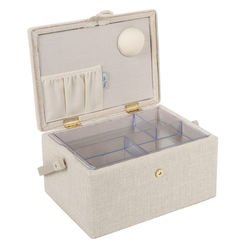 Medium-sized sewing box covered with cotton linen look fabric with embroidered sewing details on the lid. Plastic handle. Hard plastic internal tray with compartments for sewing accessories. Internal pocket and pincushion inside of lid. Item size: (d/w/h) 18.5 x 25.5 x 14.5cm. Spot clean only.