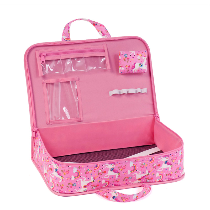 Zippered project case made from cotton fabric. Internal zippered transparent pockets to keep small items secure. Internal elastic loops for holding accessories. Pincushion in lid. Space to store ongoing projects with cross over elastic straps to secure items in place. Spot clean only. Item size: (d/w/h) 24 x 38 x 9.5cm.